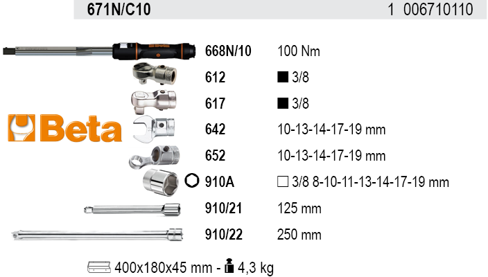 Bộ cờ lê lực Beta 671N/C10, Bộ cờ lê siết lực Beta 671N/C10, Beta torque tools set 671N/C10 là bộ dụng cụ chuyên dùng để siết lực chính xác các loại bulong, đai ốc, vít trong công nghiệp, với dải lực: 20 - 100 N.m, cỡ nhét đầu cờ lê: Ø 16 mm. Bộ cờ lê lực Beta 671N/C10 gồm 22 chi tiết: