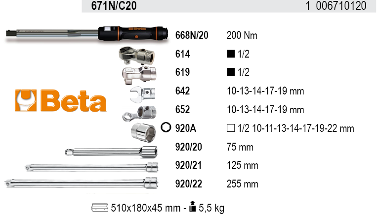 Bộ cờ lê lực Beta 671N/C20, Bộ cờ lê siết lực Beta 671N/C20, Beta torque tools set 671N/C20 là bộ dụng cụ chuyên dùng để siết lực chính xác các loại bulong, đai ốc, vít trong công nghiệp, với dải lực: 40 - 200 N.m, cỡ nhét đầu cờ lê: Ø 16 mm. Bộ cờ lê lực Beta 671N/C20 gồm 23 chi tiết: