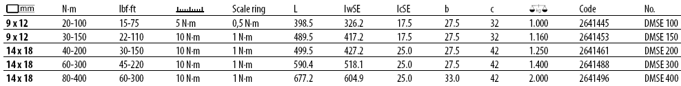 Cờ lê lực Gedore DMSE 400, cờ lê siết lực Gedore DMSE 400, Gedore torque wrench DMSE 400: là loại cờ lê lực đầu dời, chuyên dùng để siết lực (moment) chính xác các loại bulong, đai ốc, vít trong công nghiệp. Cờ lê lực Gedore DMSE 400 có dải lực siết: 80 - 400 N.m (60 - 300 lbf.ft), bước tiến: 1 N.m/vạch, size nhét đầu cờ lê: 14x18 mm.
