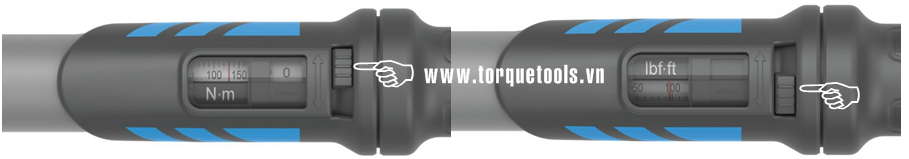 Trên thân cờ lê lực Gedore DMSE 400 trang bị hai thang đo: N.m (80 - 400 N.m) và lbf.ft (60 - 300 lbf.ft) cho phép siết lực theo hệ mét và Anh/Mỹ, quan sát dễ dàng qua cửa thăm. Với lẫy gạt đơn vị đo N.m/lbf.ft (gạt lên/xuống), cho phép chuyển đổi nhanh chóng, thuận tiện.