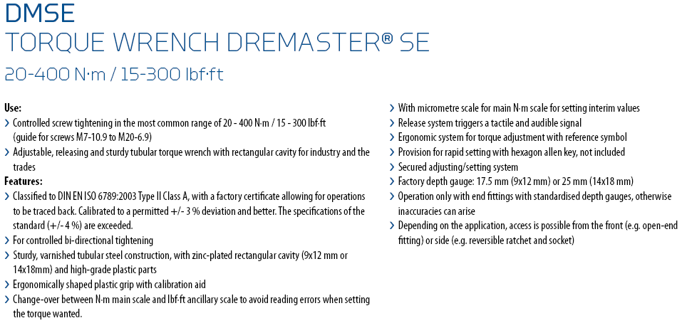 Đây là dòng sản phẩm chất lượng cao của Gedore Dremaster® SE. Sai số cờ lê lực Gedore DMSE 400 theo nhà sản xuất nêu: +/- 3%, chế tạo theo tiêu chuẩn DIN EN ISO 6789-2:2017.