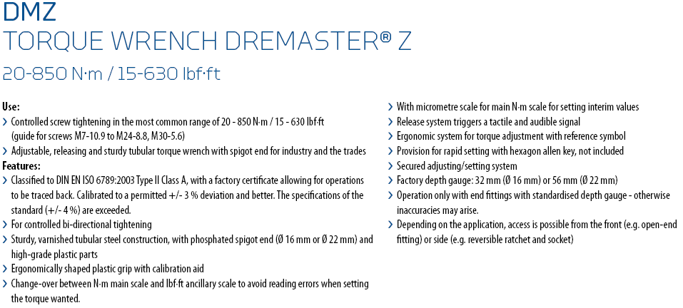 Cờ lê lực Gedore DMZ 100 thuộc dòng sản phẩm chất lượng cao của Gedore Dremaster® Z. Sai số theo nhà sản xuất nêu: +/- 3%, chế tạo theo tiêu chuẩn DIN EN ISO 6789-2:2017.