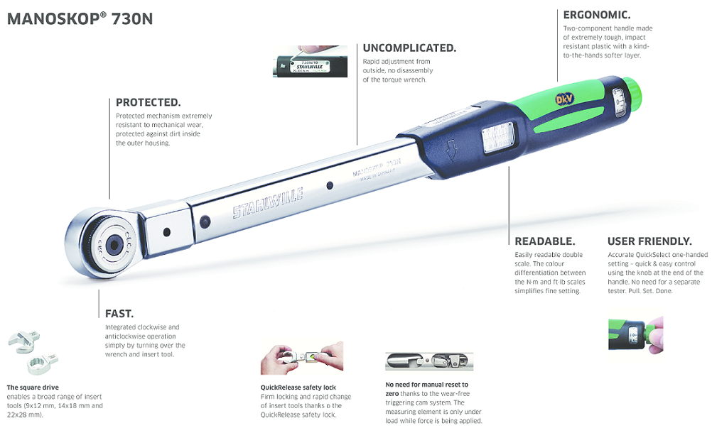 Thuộc dòng sản phẩm click MANOSKOP® 730N (khi đạt lực sẽ kêu tạch, để báo hiệu đạt lực siết).