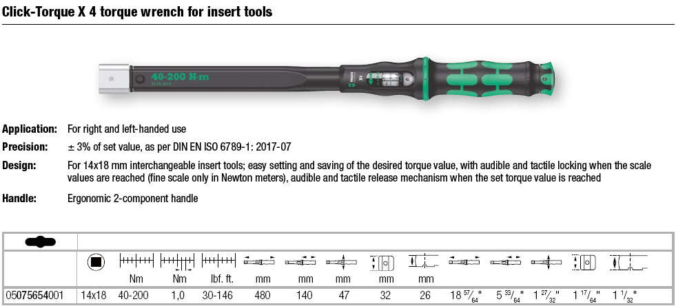 Cờ lê lực Wera 05075654001, cờ lê siết lực Wera 05075654001, Wera torque wrench 05075654001: là loại cờ lê lực đầu dời, có dải lực siết: 40 - 200 N.m (30 - 146 lbf.ft), bước tiến 1 N.m/vạch, size nhét đầu cờ lê: 14x18 mm, chuyên dùng để siết lực (moment) chính xác các loại bulong, đai ốc, vít trong công nghiệp.