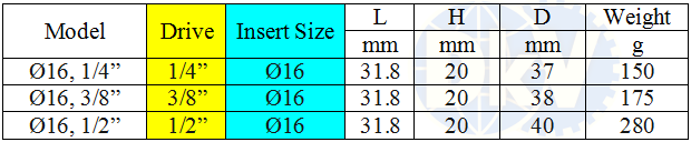 Đầu cờ lê lực chuyển khẩu size đầu vào: Ø16 mm, Ø22 mm, đầu ra: 1/4", 3/8", 1/2" chuyên dùng cho các loại cờ lê lực đầu dời của các hãng khác nhau.