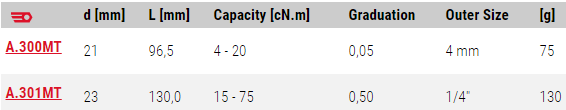 Tô vít lực Facom A.301MT, Facom torque screwdriver A.301MT có dải lực siết: 15 - 75 cN.m / 1.3 - 6.5 lbf.in, bước tiến: 0.5 cN.m/vạch, size nhét đầu vít lục giác 1/4"., chuyên dùng để siết lực (moment) chính xác các loại vít trong công nghiệp lắp ráp.