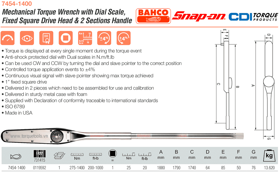 Cờ lê lực chỉ kim Bahco 7454-1400 có chiều dài tổng thể 1.880 mm, trọng lượng: 13.62 kg.