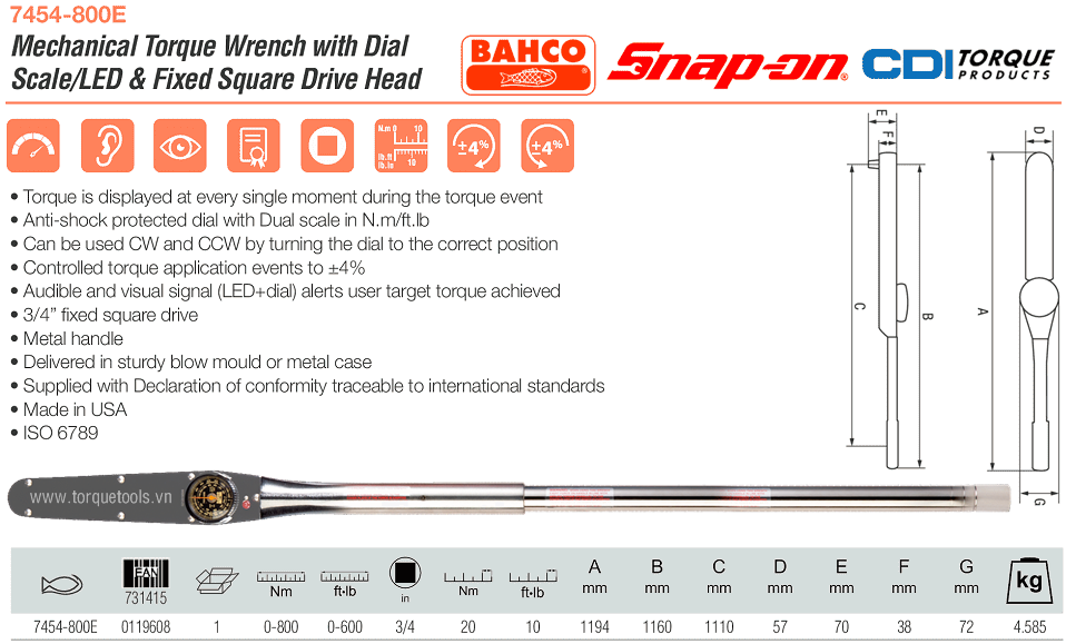 Cờ lê lực chỉ kim Bahco 7454-800E có chiều dài tổng thể 1.194 mm, trọng lượng: 4.6 kg.