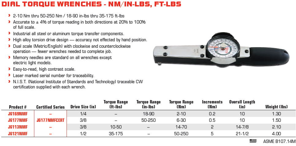Cờ lê lực chỉ kim Proto J6169NMF, cờ lê siết lực chỉ kim Proto J6169NMF, Proto dial torque wrench J6169NMF chuyên dùng để siết và check đo lực (moment) chính xác các loại bulong, đai ốc, vít trong công nghiệp lắp ráp. Có dải lực: 2 - 10 N.m (18 - 90 in.lbs), cỡ khẩu: 1/4", bước tiến: 0.2 N.m/vạch.
