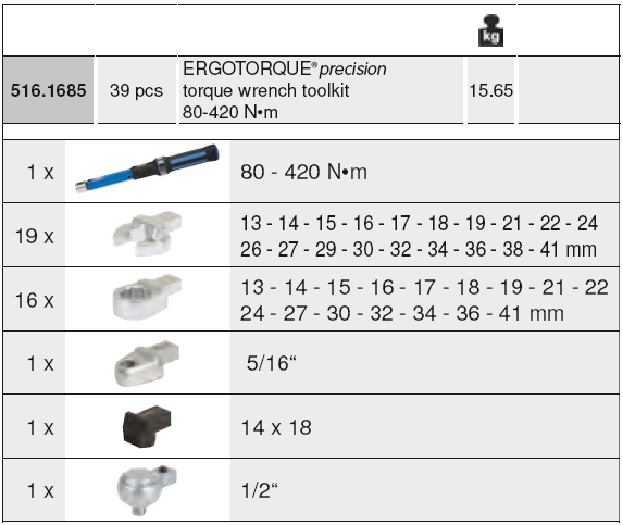 Bộ cờ lê lực KS Tools 516.1685, Bộ cờ lê siết lực KS Tools 516.1685, KS Tools torque tools set 516.1685: là bộ dụng cụ chuyên dùng để siết lực chính xác các loại bulong, đai ốc, vít trong công nghiệp, với dải lực: 80 - 420 N.m, cỡ nhét đầu cờ lê: 14x18 mm. Bộ cờ lê lực KS Tools 516.1685 gồm 39 chi tiết: