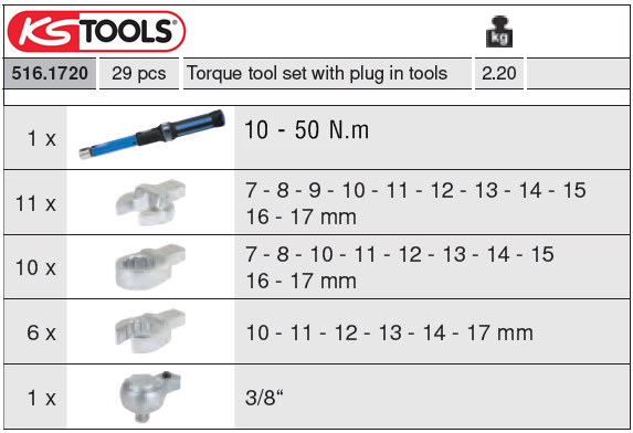 Bộ cờ lê lực KS Tools 516.1720, Bộ cờ lê siết lực KS Tools 516.1720, KS Tools torque tools set 516.1720: là bộ dụng cụ chuyên dùng để siết lực chính xác các loại bulong, đai ốc, vít trong công nghiệp, với dải lực: 5 - 50 N.m, cỡ nhét đầu cờ lê: 9x12 mm. Bộ cờ lê lực KS Tools 516.1720 gồm 29 chi tiết: