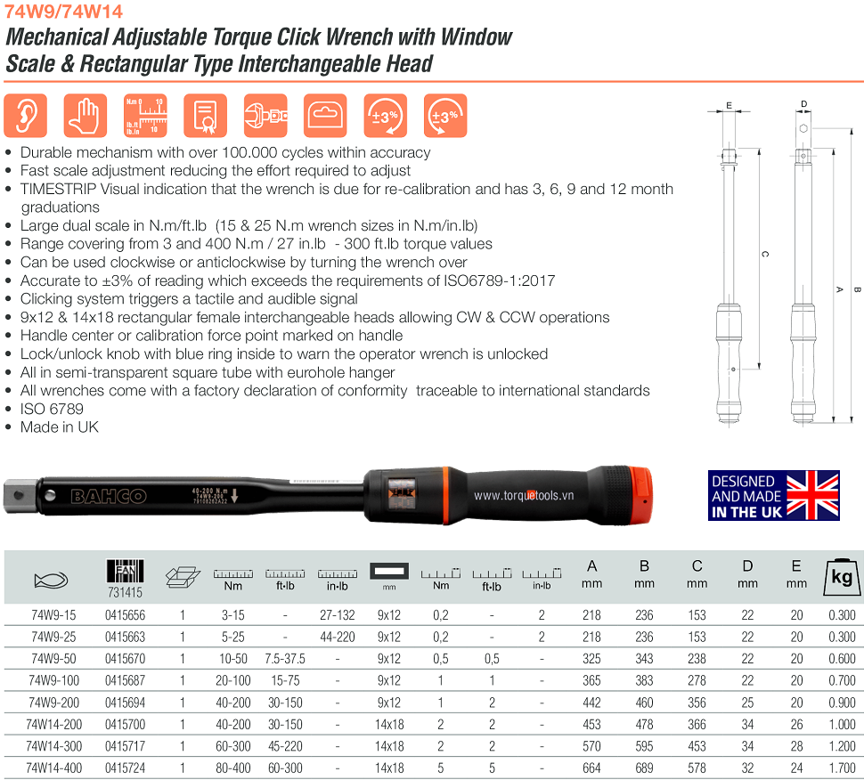 Cờ lê lực Bahco 74W14-400, cờ lê siết lực Bahco 74W14-400, Bahco torque wrench 74W14-400 là loại cờ lê lực đầu dời, chuyên dùng để siết lực (moment) chính xác các loại bulong, đai ốc, vít trong công nghiệp. Cờ lê siết lực Bahco 74W14-400 có dải lực siết: 80 - 400 N.m (60 - 300 ft.lb), bước tiến: 5 N.m/vạch (5 ft.lb/vạch), size nhét đầu cờ lê: 14x18 mm.