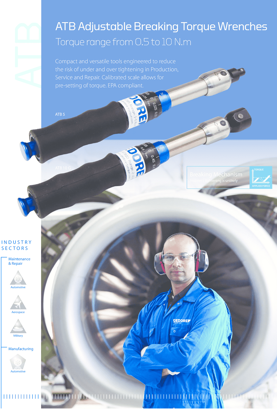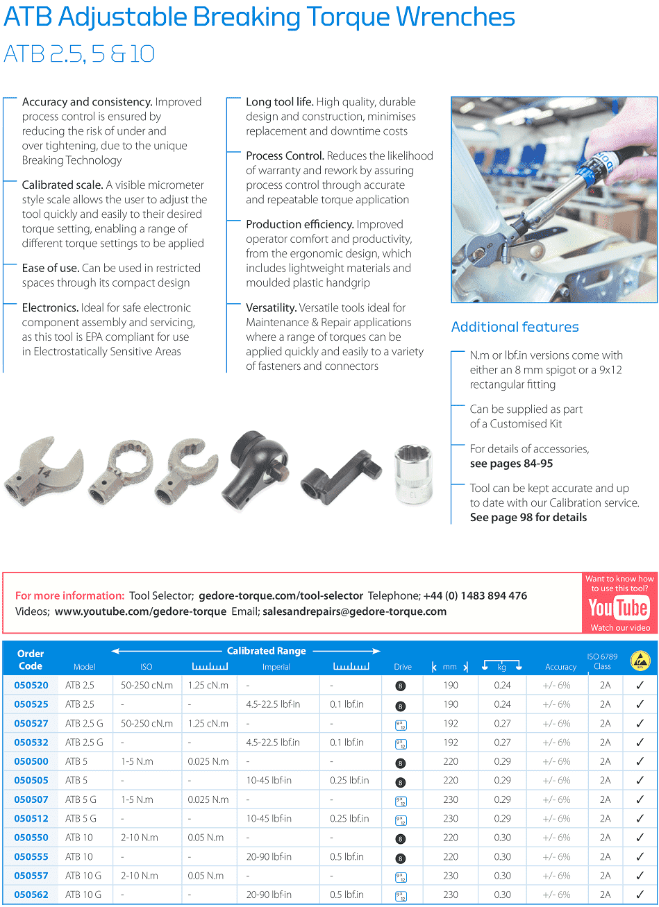 Cờ lê lực Gedore ATB 2.5 G, cờ lê siết lực Gedore ATB 2.5 G, Gedore torque wrench 2.5 G: là loại cờ lê lực đầu dời, chuyên dùng để siết lực (moment) chính xác các loại bulong, đai ốc, vít trong công nghiệp. Cờ lê siết lực ATB 2.5 G có dải lực siết: 0.5 - 2.5 N.m, bước tiến: 0.0125 N.m/vạch, size nhét đầu cờ lê: 9x12 mm.