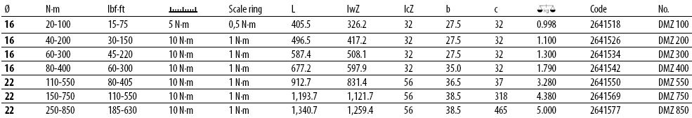 Cờ lê lực Gedore DMZ 100, cờ lê siết lực Gedore DMZ 100, Gedore torque wrench DMZ 100: là loại cờ lê lực đầu dời, chuyên dùng để siết lực (moment) chính xác các loại bulong, đai ốc, vít trong công nghiệp. Cờ lê siết lực DMZ 100 có dải lực siết: 20 - 100 N.m (15 - 75 lbf.ft), bước tiến: 0.5 N.m/vạch, size nhét đầu cờ lê: Ø16 mm.