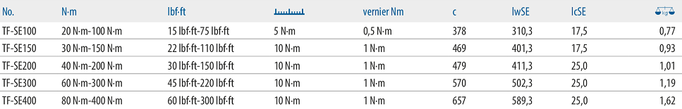 Cờ lê siết lực Gedore TF-SE100 có dải lực siết: 20 - 100 N.m (15 - 75 lbf.ft), bước tiến: 0.5 N.m/vạch, size nhét đầu cờ lê: 9x12 mm.
