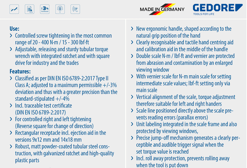 Sai số cờ lê lực Gedore TF-SE100 theo nhà sản xuất nêu: +/- 3%, chế tạo theo tiêu chuẩn DIN EN ISO 6789-2:2017.