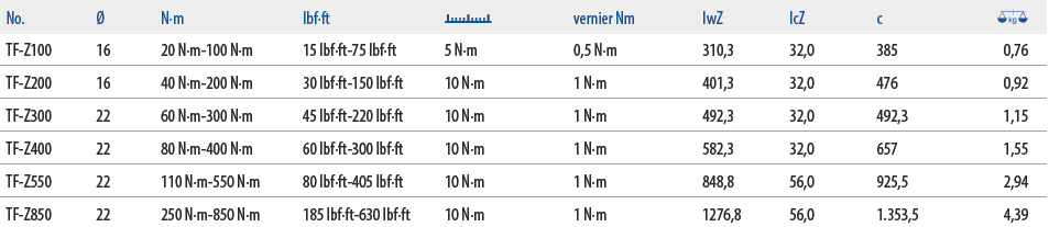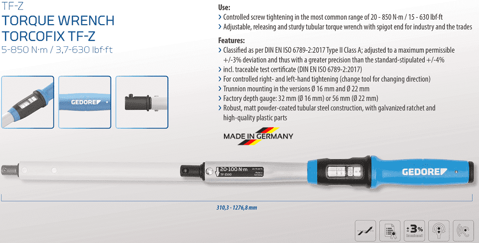 Cờ lê lực Gedore TF-Z100, cờ lê siết lực Gedore TF-Z100, Gedore torque wrench TF-Z100: là loại cờ lê lực đầu dời, thuộc dòng sản phẩm chất lượng cao, mới đưa vào sản xuất Torcofix TF-Z của Gedore/Germany chuyên dùng để siết lực (moment) chính xác các loại bulong, đai ốc, vít trong công nghiệp.