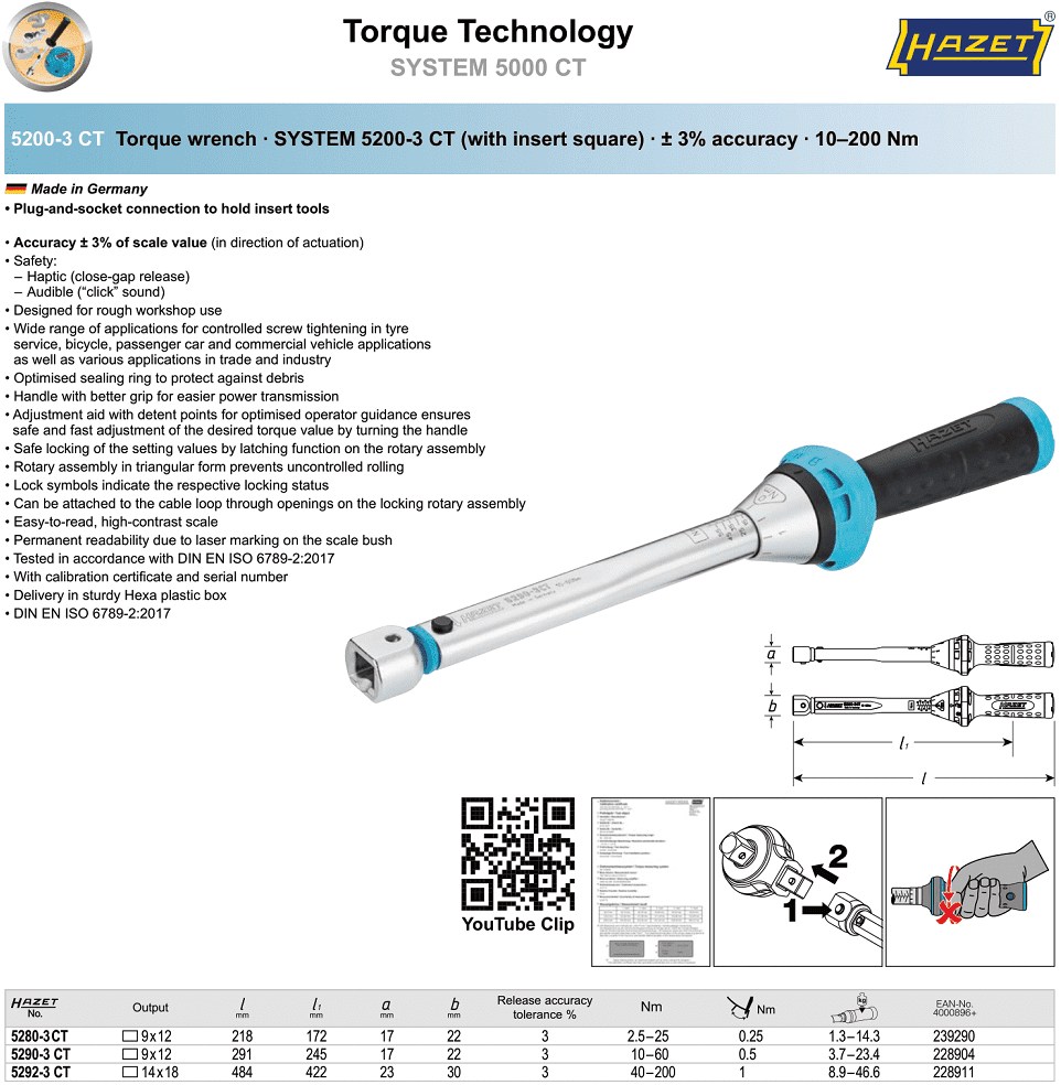 Cờ lê lực Hazet 5280-3 CT, Cờ lê siết lực Hazet 5280-3 CT, Hazet torque wrench 5280-3 CT: thuộc dạng cờ lê lực đầu dời, có dải lực siết: 2.5 - 25 N.m, size đầu nhét cờ lê: 9 x 12mm, bước tiến: 0.25 N.m/vạch. Cờ lê lực Hazet 5280-3 CT có sai số chế tạo: +/- 3%.