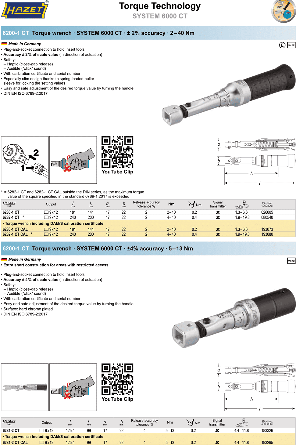 Cờ lê lực Hazet 6282-1 CT, Cờ lê siết lực Hazet 6282-1 CT, Hazet torque wrench 6282-1 CT: thuộc dạng cờ lê lực đầu dời, có dải lực siết: 4 - 40 N.m, size đầu nhét cờ lê: 9 x 12mm, bước tiến: 0.4 N.m/vạch. Cờ lê lực Hazet 6282-1 CT có sai số chế tạo: +/-2%.
