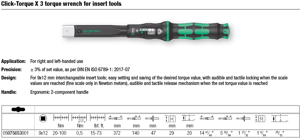 Cờ lê lực Wera 05075653001, cờ lê siết lực Wera 05075653001, Wera torque wrench 05075653001 là loại cờ lê lực đầu dời, có dải lực siết: 20 - 100 N.m (15 - 73 lbf.ft), bước tiến 0.5 N.m/vạch, size nhét đầu cờ lê: 9x12 mm, chuyên dùng để siết lực (moment) chính xác các loại bulong, đai ốc, vít trong công nghiệp.