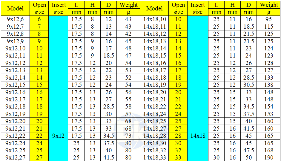 Đầu cờ lê lực dạng tròng hở size đầu vào: 9x12 mm, 14x18 mm, đầu ra: 6 - 75 mm chuyên dùng cho các loại cờ lê lực đầu dời của các hãng khác nhau.
