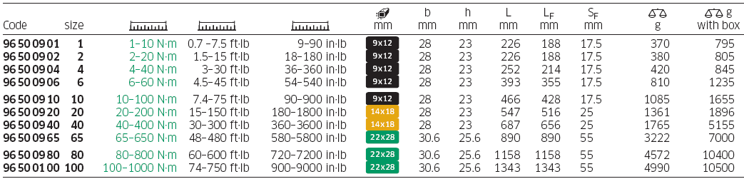 Sai số chế tạo: +/-2 %, sai số góc: +/-1%. Các đơn vị đo: N.m, cN.m, lbf.ft, lbf.in. Chế độ đo siết: Peak, Track, Angle.