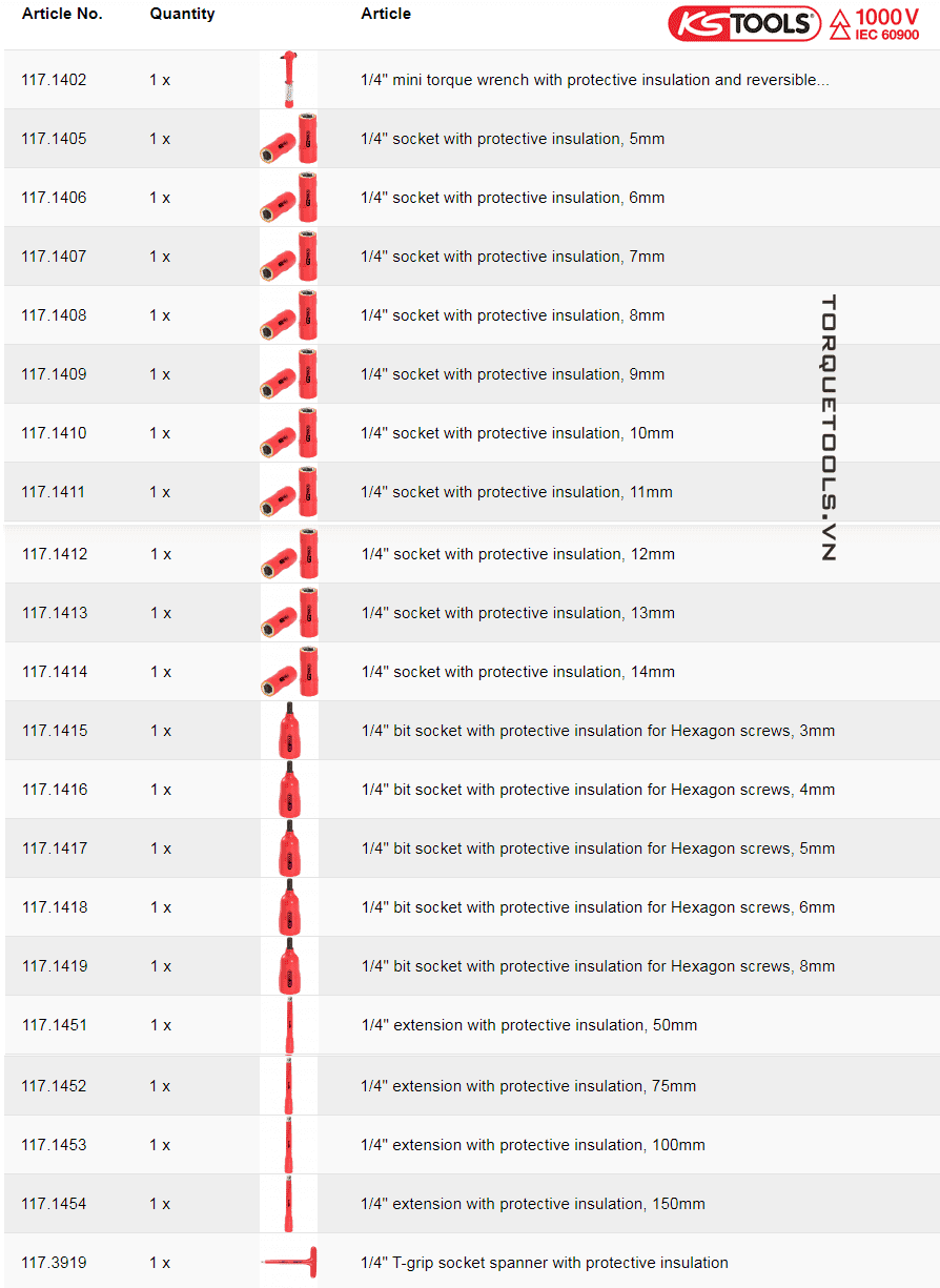 Khẩu 6 cạnh cách điện KS Tools 117.1405, 117.1406...117.1414 (1/4" | 5, 6, 7, 8, 9, 10, 11, 12, 13 và 14 mm): 10 chiếc.