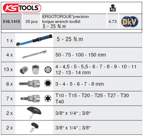 Bộ cờ lê lực KS Tools 516.1415, Bộ cờ lê siết lực KS Tools 516.1415chuyên dùng để siết lực chính xác các loại bulong, đai ốc, vít trong công nghiệp, với dải lực siết: 5 - 25 N.m. Bộ cờ lê lực KS Tools 516.1415 gồm 32 chi tiết, đựng trong hộp thép. trọng lượng: 4.73 kg.