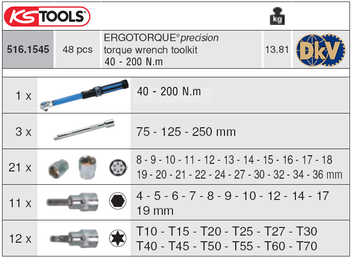 Bộ cờ lê lực KS Tools 516.1545 chuyên dùng để siết lực chính xác các loại bulong, đai ốc, vít trong công nghiệp, với dải lực siết: 40 - 200 N.m. Bộ cờ lê lực KS Tools 516.1545 gồm 48 chi tiết, đựng trong hộp thép. trọng lượng: 13.81 kg.