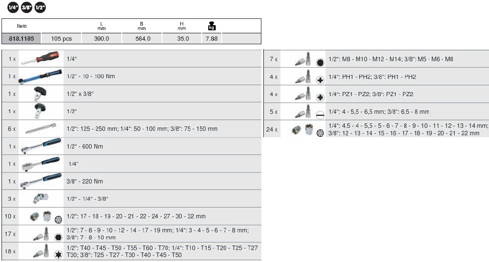 Bộ cờ lê lực KS Tools 818.1185, Bộ cờ lê siết lực KS Tools 818.1185, KS Tools torque wrench set 818.1185 chuyên dùng để siết lực chính xác các loại bulong, đai ốc, vít trong công nghiệp, với dải lực siết: 10 - 100 N.m. Bộ cờ lê lực KS Tools 818.1185 gồm 105 chi tiết, đựng trong hộp thép. trọng lượng: 7.88 kg. Sử dụng bộ cờ lê lực KS Tools 818.1185 đa năng cho nhiều ứng dụng siết phổ biến: 1/4", 3/8" và 1/2".