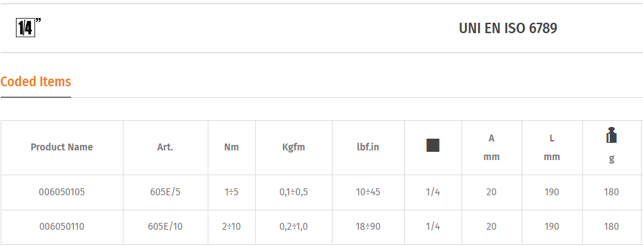 Cờ lê lực Beta 605E/5, cờ lê siết lực Beta 605E/5, Beta torque wrench 605E/5 (Mã đặt hàng: 006050105) là loại cờ lê lực đầu liền, có dải lực: 1 - 5 N.m (10 - 45 lbf.in), cỡ khẩu: 1/4", chuyên dùng để siết lực (moment) chính xác trong công nghiệp. Cờ lê lực Beta 605E/5 có sai số chế tạo: +/-6%, với số lần siết lực ~ 5.000 lần mới phải hiệu chuẩn (calibration). Chiều dài: 190 mm, trọng lượng: 0.18 kg.