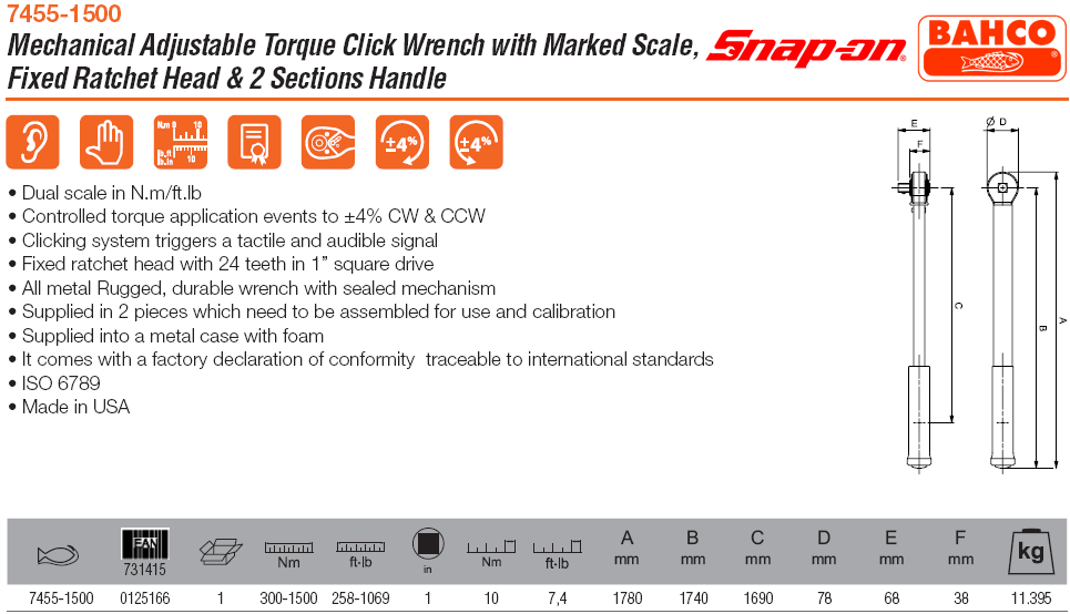 Cờ lê lực Bahco 7455-1500, cờ lê siết lực Bahco 7455-1500, Bahco torque wrench 7455-1500 chuyên dùng để siết lực (moment) chính xác các loại bulong, đai ốc, vít trong công nghiệp. Cờ lê siết lực Bahco 7455-1500 có dải lực siết: 300 - 1.500 N.m (258 - 1.069 ft.lb), bước tiến: 10 N.m/vạch (7.4 ft.lb/vạch), size nhét đầu khẩu: 1".