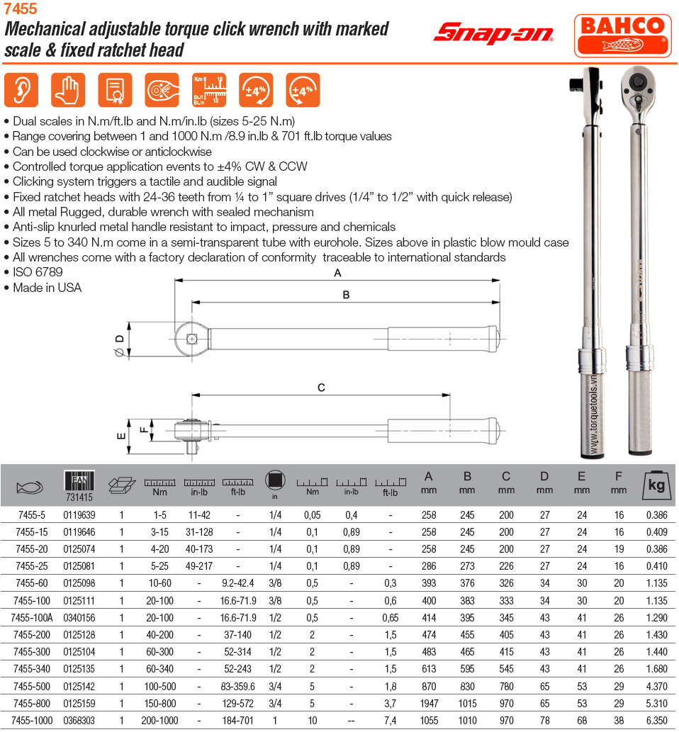 Cờ lê lực Bahco 7455-60, cờ lê siết lực Bahco 7455-60, Bahco torque wrench 7455-60 chuyên dùng để siết lực (moment) chính xác các loại bulong, đai ốc, vít trong công nghiệp. Cờ lê siết lực Bahco 7455-60 có dải lực siết: 10 - 60 N.m (9.2 - 42.4 ft.lb), bước tiến: 0.5 N.m/vạch (0.3 ft.lb/vạch), size nhét đầu khẩu: 3/8".