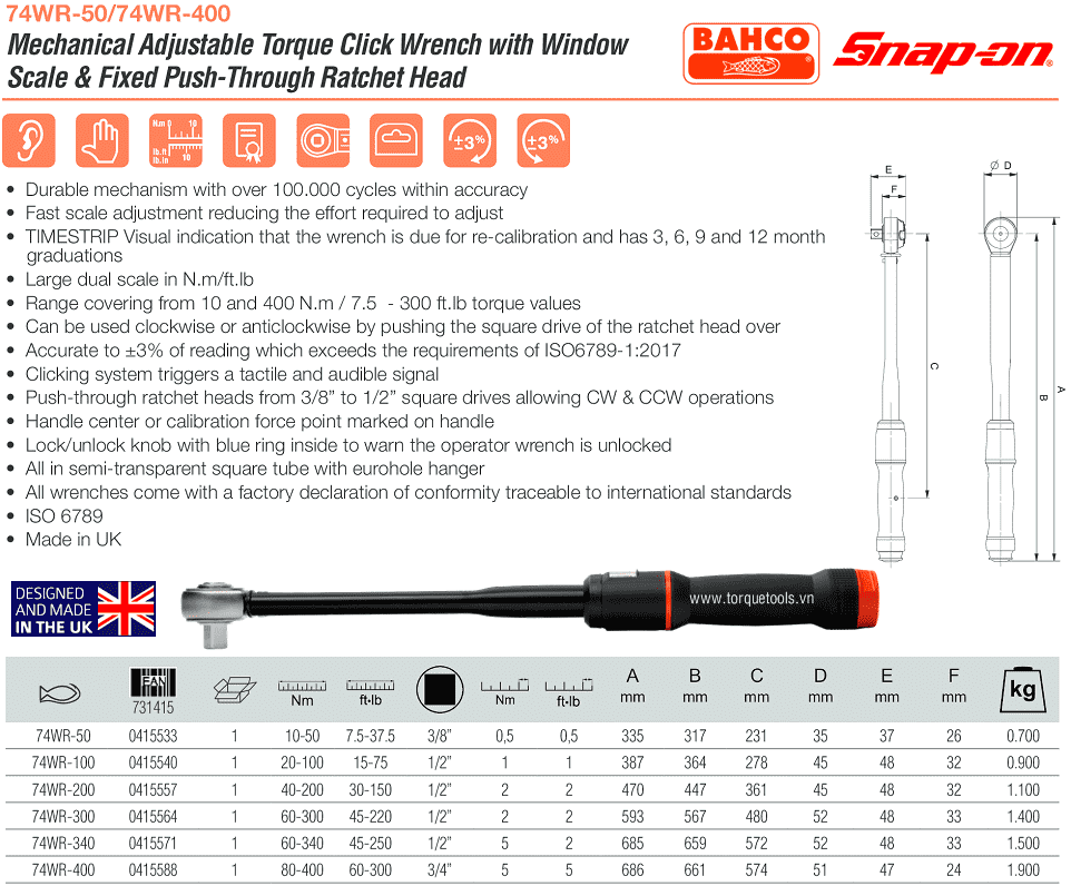 Sai số cờ lê lực Bahco 74WR-100 theo nhà sản xuất nêu: +/- 3%, chế tạo theo tiêu chuẩn DIN EN ISO 6789. Chiều dài: 387 mm. Trọng lượng: 0.9 kg.
