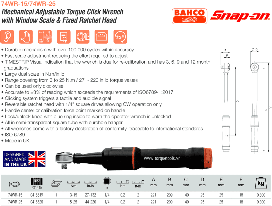 Cờ lê lực Bahco 74WR-15, cờ lê siết lực Bahco 74WR-15, Bahco torque wrench 74WR-15 chuyên dùng để siết lực (moment) chính xác các loại bulong, đai ốc, vít trong công nghiệp. Cờ lê lực Bahco 74WR-15 có dải lực siết: 3 - 15 N.m (27 - 132 in.lb), bước tiến: 0.2 N.m/vạch (2 in.lb/vạch), size nhét đầu khẩu: 1/4".