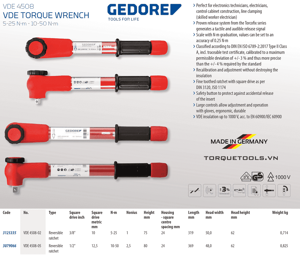 Cờ lê lực cách điện Gedore VDE 4508-02, cờ lê siết lực cách điện Gedore VDE 4508-02, Gedore insulated torque wrench VDE 4508-02: có dải lực siết 5 - 25 N.m, cỡ khẩu 3/8", chuyên dùng để siết lực (moment) chính xác các loại bulong, đai ốc trong môi trường điện cao thế (< AC 1.000 V, < DC 1.500V).