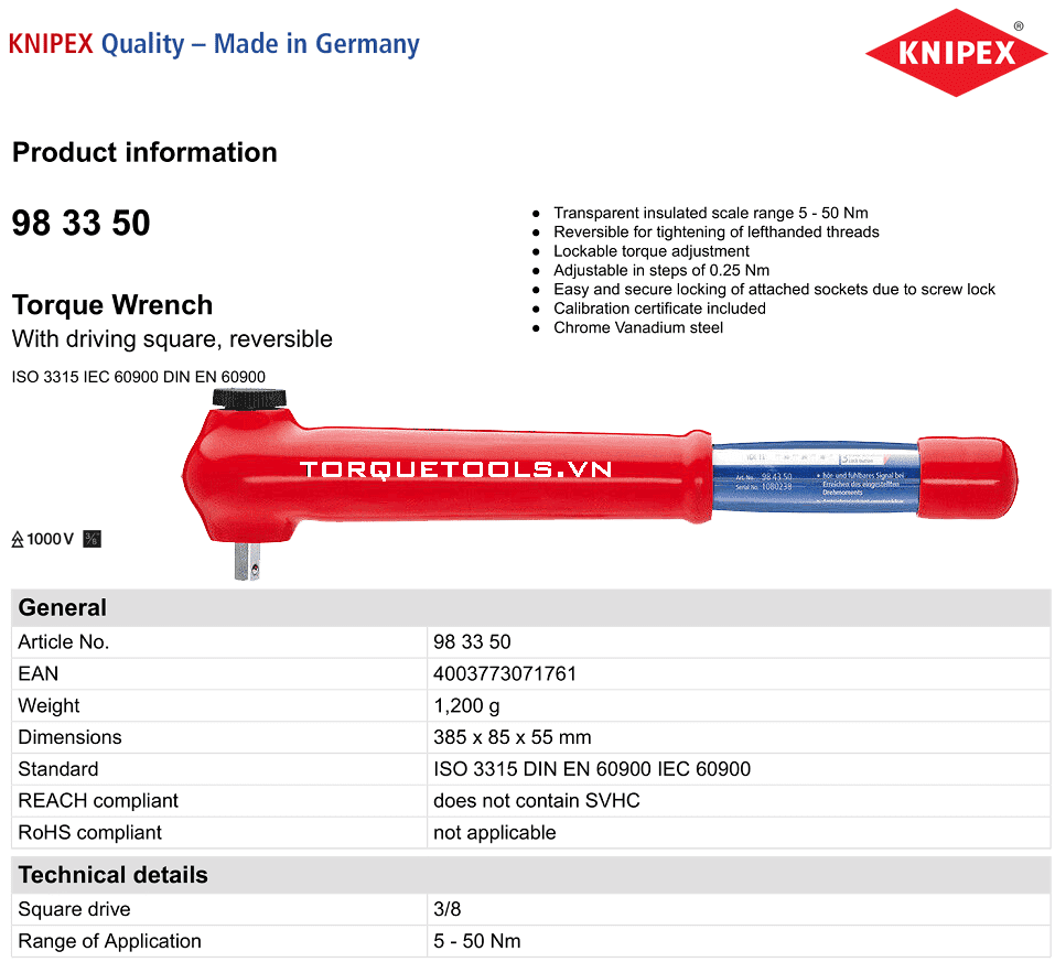 Cờ lê lực cách điện Knipex 98 33 50 được chế tạo và thử nghiệm theo tiêu chuẩn DIN EN ISO 6789: 2003. Sai số chế tạo: +/- 3%. Với số lần siết khuyến nghị > 5.000 lần mới phải hiệu chuẩn.