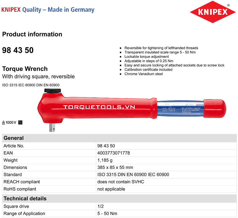 Cờ lê lực cách điện Knipex 98 43 50 được chế tạo và thử nghiệm theo tiêu chuẩn DIN EN ISO 6789: 2003. Sai số chế tạo: +/- 3%. Với số lần siết khuyến nghị > 5.000 lần mới phải hiệu chuẩn.