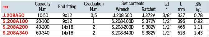 Cờ lê lực Facom S.208A200, Cờ lê siết lực Facom S.208A200, Facom torque wrench S.208A200 là dụng cụ chuyên dùng để siết lực (moment) chính xác, các loại bulong, đai ốc, vít trong công nghiệp. Dải lực siết: 40 - 200 N.m, cỡ khẩu chụp: 1/2", bước tiến: 2 N.m/vạch, chiều dài 466 mm, trọng lượng: 1.11 kg.