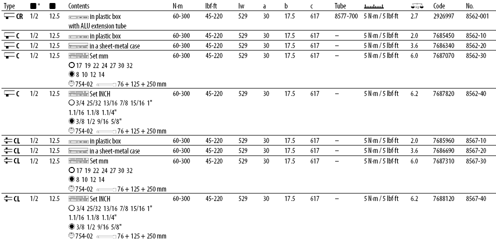 Cờ lê lực Gedore 8562-10, Gedore torque wrench 8562-10 là dòng sản phẩm cờ lê lực thân vỏ hợp kim nhôm, có dải lực 60 - 300 N.m (45 - 220 lbf.ft) size khẩu: 1/2", bước tiến 5 N.m/vạch, sai số: +/-3%, chuyên dùng để siết lực chính xác các loại bulong cỡ vừa trong công nghiệp.