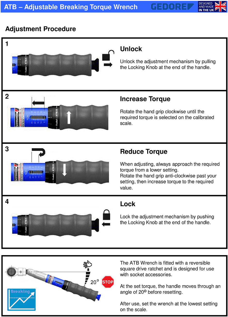 Thao tác vận hành cờ lê lực Gedore ATB 25 A: vẫn theo kiểu kinh điển, phổ dụng, sự phối hợp của thang đo dọc và thang đo ngang (thông qua mở/đóng khóa đuôi, vặn tiến lên/xuống) để cho chỉ số lực cần siết. Núm đảo chiều quay (chiều siết) gắn ở đầu cờ lê lực Gedore, cho phép chuyển đổi nhanh chóng.