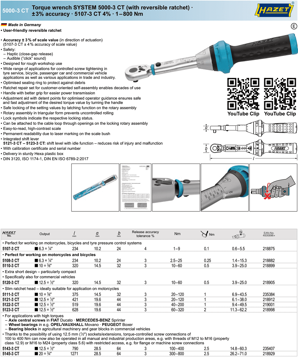 Cờ lê lực Hazet 5107-3 CT, cờ lê cân lực Hazet 5107-3 CT, Hazet torque wrench 5107-3 CT có các đặc điểm: