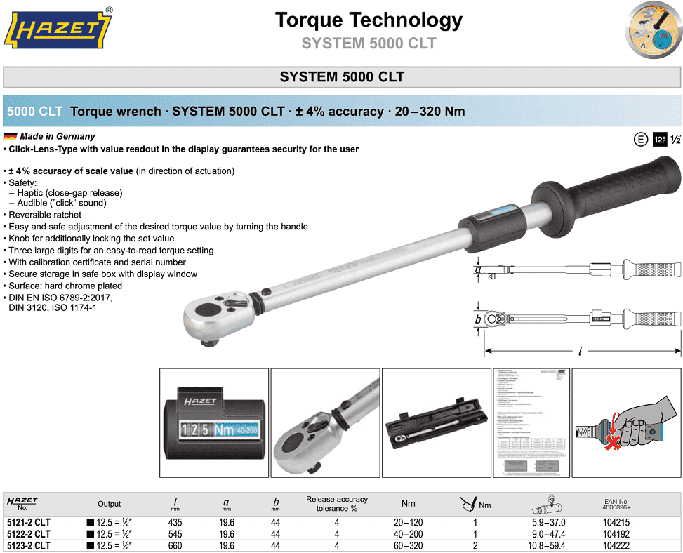 Cờ lê lực Hazet 5121-2 CLT, cờ lê cân lực Hazet 5121-2 CLT, Hazet torque wrench 5121-2 CLT có các đặc điểm: