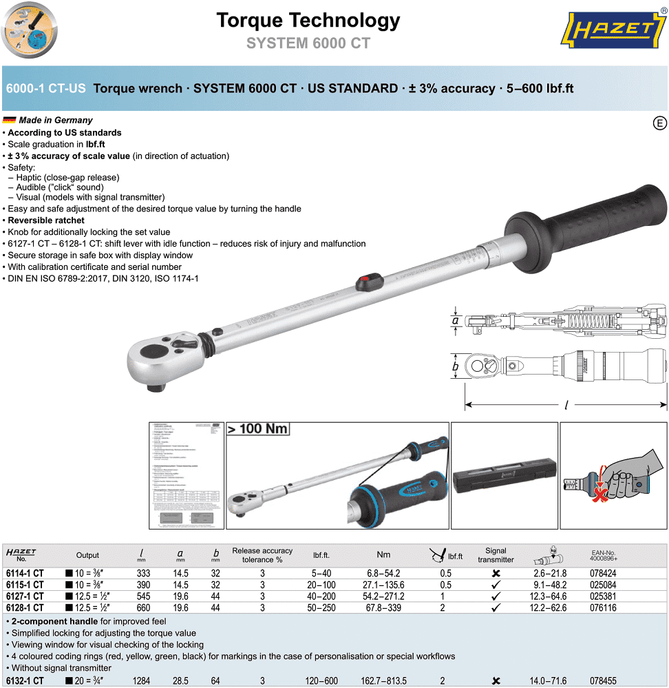 Cờ lê lực Hazet 6114-1 CT, Cờ lê cân lực Hazet 6114-1 CT, Hazet torque wrench 6114-1 CT có các đặc điểm: