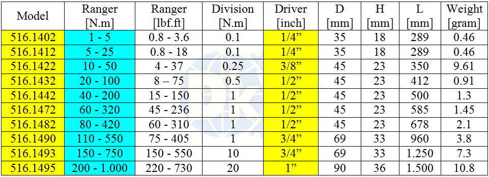 Sai số theo nhà sản xuất KS Tools 516.1412 nêu là 3%, với số lần siết lực ~ 5.000 lần mới phải hiệu chuẩn (calibration). Chiều dài: 289 mm, trọng lượng: 0.46 kg.