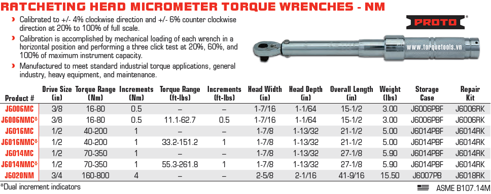 Bước tiến cờ lê lực Proto J6006MC: 0.5 N.m/vạch, sai số theo nhà sản xuất nêu: +/- 4% - +/-6% trong dải 20 - 100% tải, chế tạo theo tiêu chuẩn EN ISO 6789:2003 Type II Class A. Chiều dài (A): 15-1/2 inch. Trọng lượng: 3 lbs.