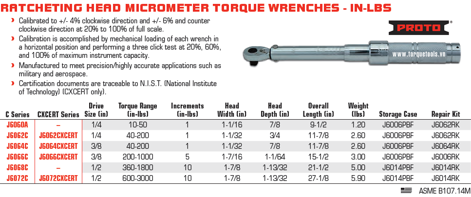 Bước tiến cờ lê lực Proto J6062C: 1 in.lbs/vạch, sai số theo nhà sản xuất nêu: +/- 4% - +/-6% trong dải 20 - 100% tải, chế tạo theo tiêu chuẩn EN ISO 6789:2003 Type II Class A. Chiều dài (A): 11-7/8 inch. Trọng lượng: 2.6 lbs.