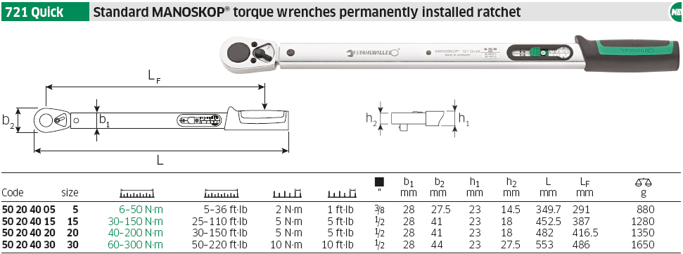 Cờ lê lực Stahlwille 50204005, cờ lê siết lực Stahlwille 50204005, Stahlwille torque wrench 50204005 thuộc dòng sản phẩm 721 Quick MANOSKOP® của Stahlwille/Germany. Cờ lê lực Stahlwille 50204005 thuộc dạng đầu liền dùng khẩu, có dải lực 6 - 50 N.m (5 - 36 ft.lbs), bước tiến: 2 N.m/vạch, cỡ khẩu: 3/8".