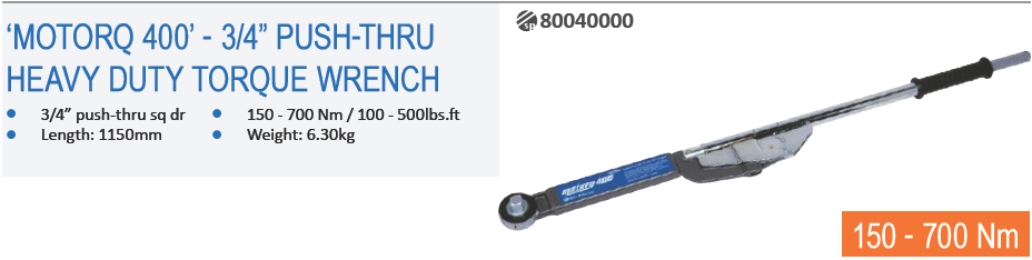 Cờ lê lực Sykes Pickavant Motorq 400, Cờ lê siết lực Sykes Pickavant Motorq 400 (Code: 80040000) là thuộc loại cờ lê lực Sykes Pickavant công nghiệp đầu liền, có dải lực siết: 150 - 700 N.m (100 - 500 lbs.ft), cỡ khẩu: 3/4", chuyên dùng để siết lực (moment) chính xác các loại bulong, đai ốc trong công nghiệp.
