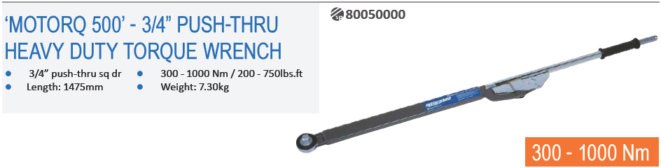 Cờ lê lực Sykes Pickavant Motorq 500, Cờ lê siết lực Sykes Pickavant Motorq 500 (Code: 80050000) là thuộc loại cờ lê lực Sykes Pickavant công nghiệp đầu liền, có dải lực siết: 300 - 1.000 N.m (200 - 750 lbs.ft), cỡ khẩu: 3/4", chuyên dùng để siết lực (moment) chính xác các loại bulong, đai ốc trong công nghiệp.